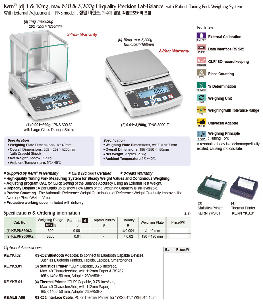 Kern® [d] 1 & 10mg, max.620 & 3,200g Hi-quality Precision Lab-Balance, with Robust Tuning Fork Weighing SystemWith External Adjustment, “PNS-model”, 정밀 바란스, 계수계 겸용, 작업보호커버 포함