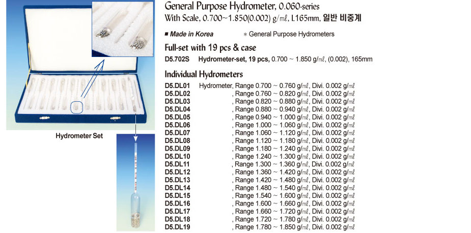 General Purpose Hydrometer, 0.060-seriesWith Scale, 0.700~1.850(0.002) g/㎖, L165mm, 일반 비중계