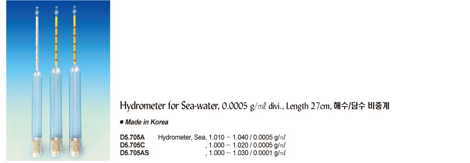 Hydrometer for Sea-water, 0.0005 g/㎖ divi., Length 27cm, 해수/담수 비중계