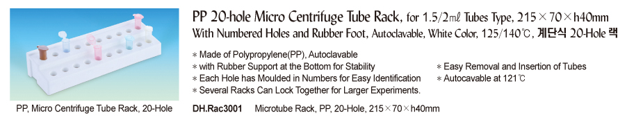 PP 20-hole Micro Centrifuge Tube Rack, for 1.5/2㎖ Tubes Type, 215×70×h40mmWith Numbered Holes and Rubber Foot, Autoclavable, White Color, 125/140℃, 계단식 20-Hole 랙