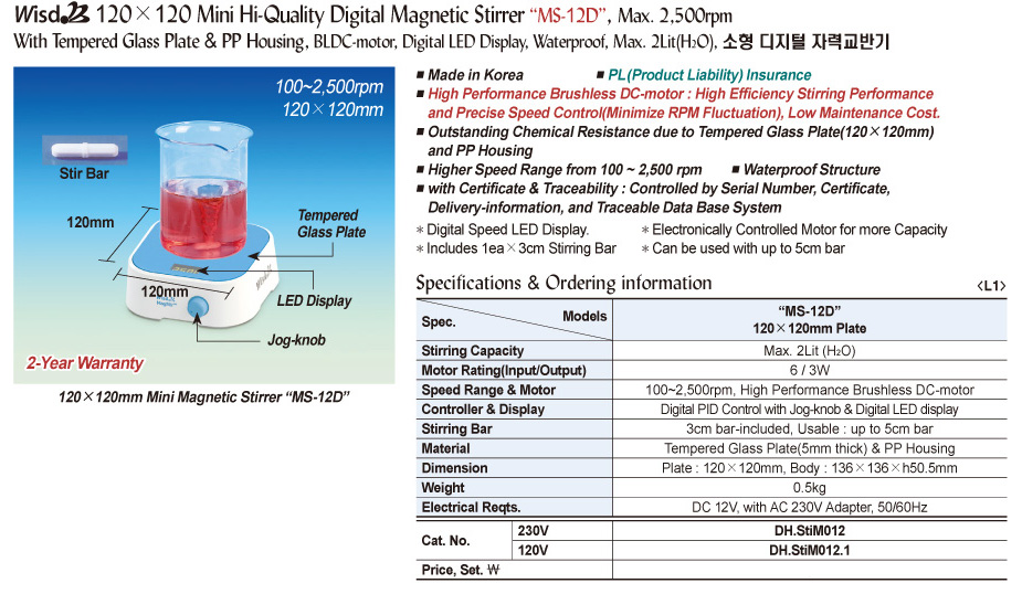 Wisd 120×120 Mini Hi-Quality Digital Magnetic Stirrer “MS-12D”, Max. 2,500rpmWith Tempered Glass Plate & PP Housing, BLDC-motor, Digital LED Display, Waterproof, Max. 2Lit(H2O), 소형 디지털 자력교반기